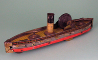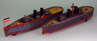 | A newer style battleship, circa 1920s. These two examples were the largest modern style battleship produced by Hess. Both of these are clockwork powered, but the one on the right has an on / off switch as well. Battleship on right missing two deck guns. These larger battleships were sold separately and with two or more submarines following attached with formed wire connectors. Although I have not seen catalog evidence, I believe these were also sold with smaller battleships also attached with formed wire connectors. | ||||